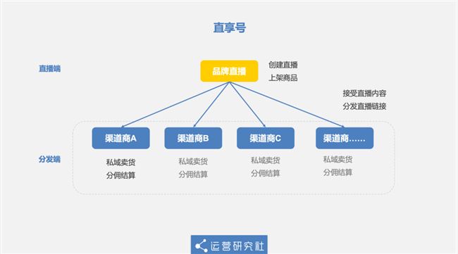 另一端,是分發端。渠道商可以用分發端去接受品牌商的直播內容和商品,在自己的私域流量進行賣貨,并獲得分傭結算。