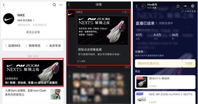 比如,Nike 就通過自有公眾號、小程序和社群激活私域流量池,同時在朋友圈、騰訊視頻、QQ音樂等平臺投放,最終小程序直播觀看人次達到近 100 萬。