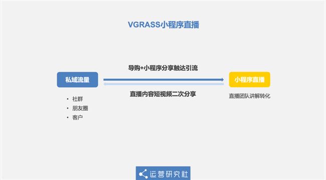 服飾品牌 VGRASS 則在今年 2 月開始嘗試小程序直播,通過導購和小程序分享觸達用戶;同時導購還會在社群里,把直播間內容剪成短視頻,二次觸達社群和朋友圈里的用戶。半年來,VGRASS 小程序銷售破 9000 萬,其中直播業績占比 36%。