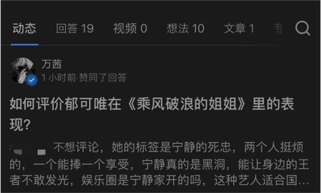 9 月 6 日凌晨,有網友發現萬茜在知乎上點贊寧靜和郁可唯的惡評,隨后引發熱議。事件發酵后,萬茜在幾小時后取消了點贊。