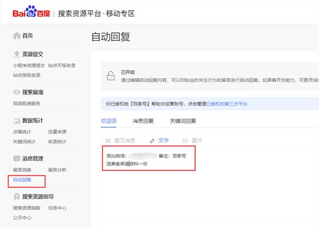 熊掌號的后臺有個自動回復的功能,把你需要引流的東西寫進去即可,只要粉絲一關注你,那么他就會自動回復這段話給粉絲,這樣粉絲看到了,他有興趣的話就會加你的聯系方式。