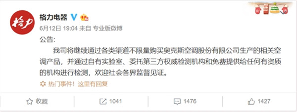 就在昨天,格力電器官方微博發(fā)布最新公告,表示繼續(xù)通過各類渠道不限量購買奧克斯空調(diào)股份有限公司生產(chǎn)的相關(guān)空調(diào)產(chǎn)品,并通過自有實(shí)驗(yàn)室、委托第三方權(quán)威檢測機(jī)構(gòu)和免費(fèi)提供給任何有資質(zhì)的機(jī)構(gòu)進(jìn)行檢測,歡迎社會各界監(jiān)督見證。